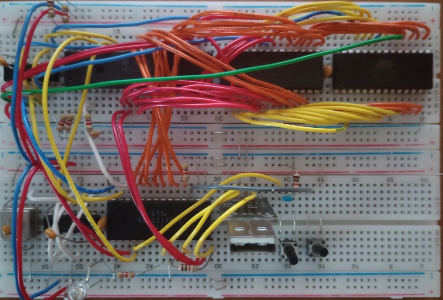 28C64. Lower breadboard has quartz oscillator 7.3728 MHz, 74HC74,