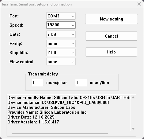 Tera Term Serial port needs another setup with Transmit delay: