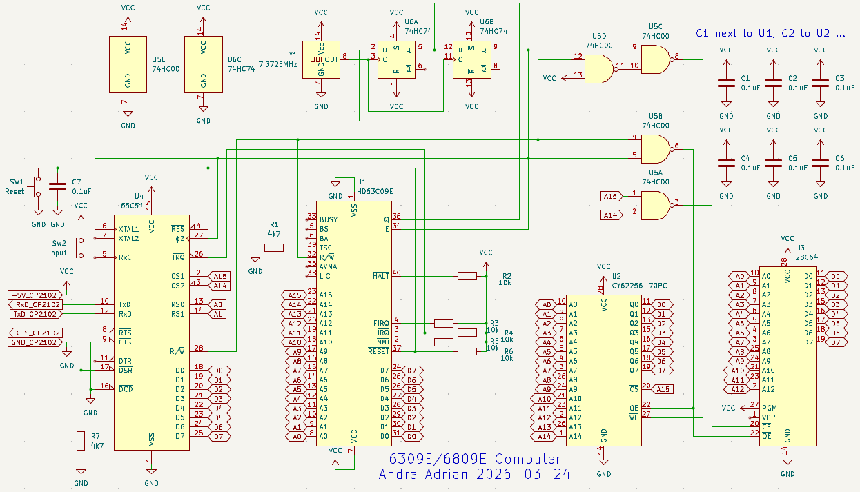 breadboard has glue-logic 74HC00, CPU 6309E, RAM 62256 and ROM