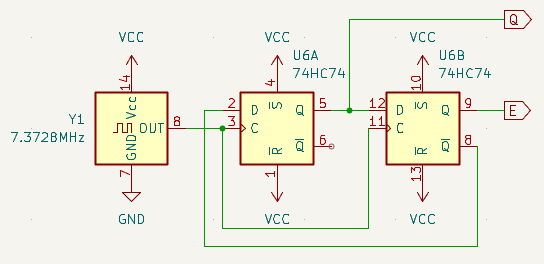 The E, Q in-phase and quadrature clocks are created with two D