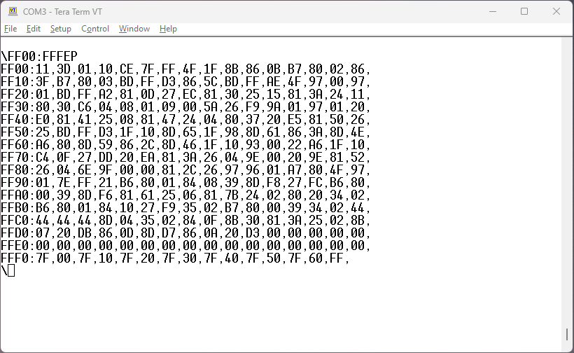 Tera Term screenshot with mon6809 Hex listing.