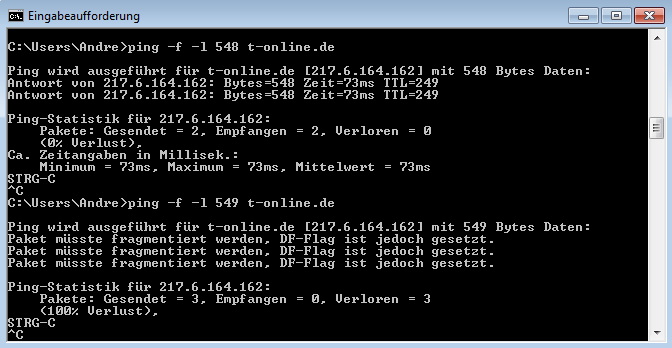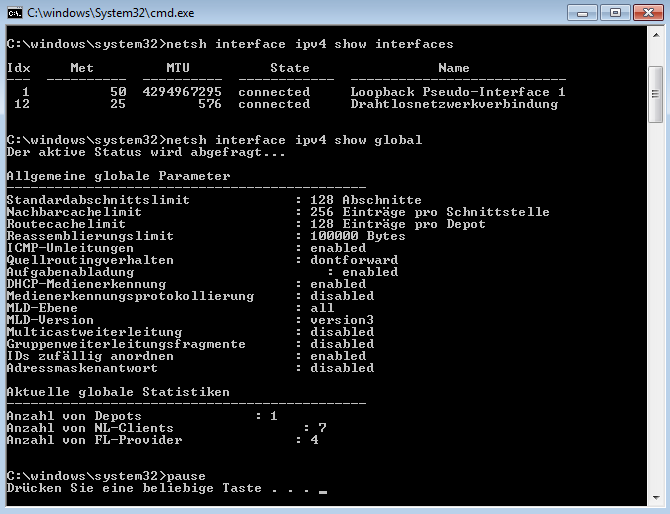 rem MTUset.bat rem MS-Windows Vista, 7 setze MTU auf 576, Reassembly Buffer auf 100000 netsh interface ipv4 set subinterface "Drahtlosnetzwerkverbindung" mtu=576 store=persistent netsh interface ipv4 set global 128 256 128 100000 store=persistent netsh interface ipv4 show interfaces netsh interface ipv4 show global pause |