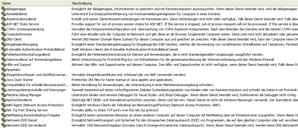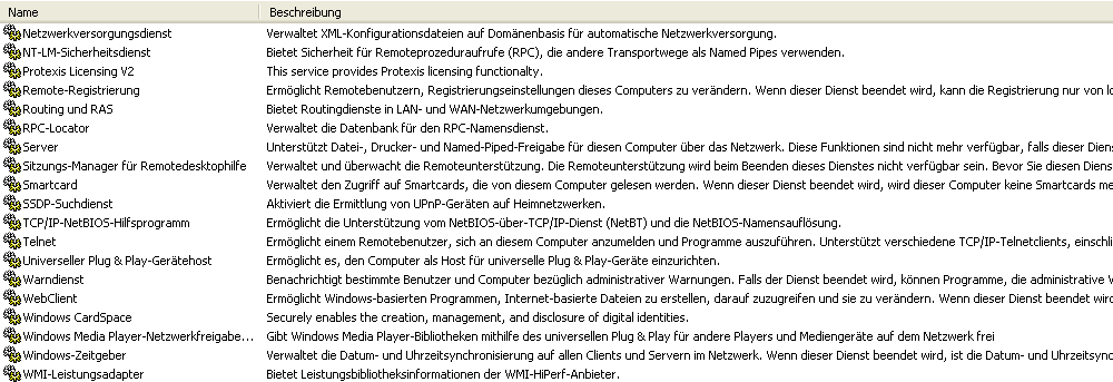 Arbeitsstationsdienst | SMB Protokoll, die MS-Windows Kopie von NFS (Network File System). Nicht nötig für normale Internetnutzung. Im Moment (10. September 2010) eine Schwachstelle in MS-Windows. |